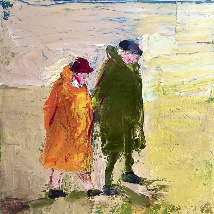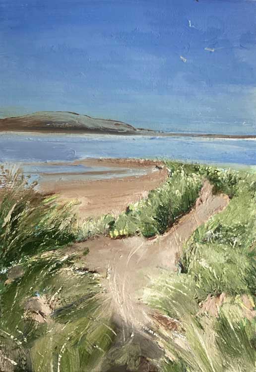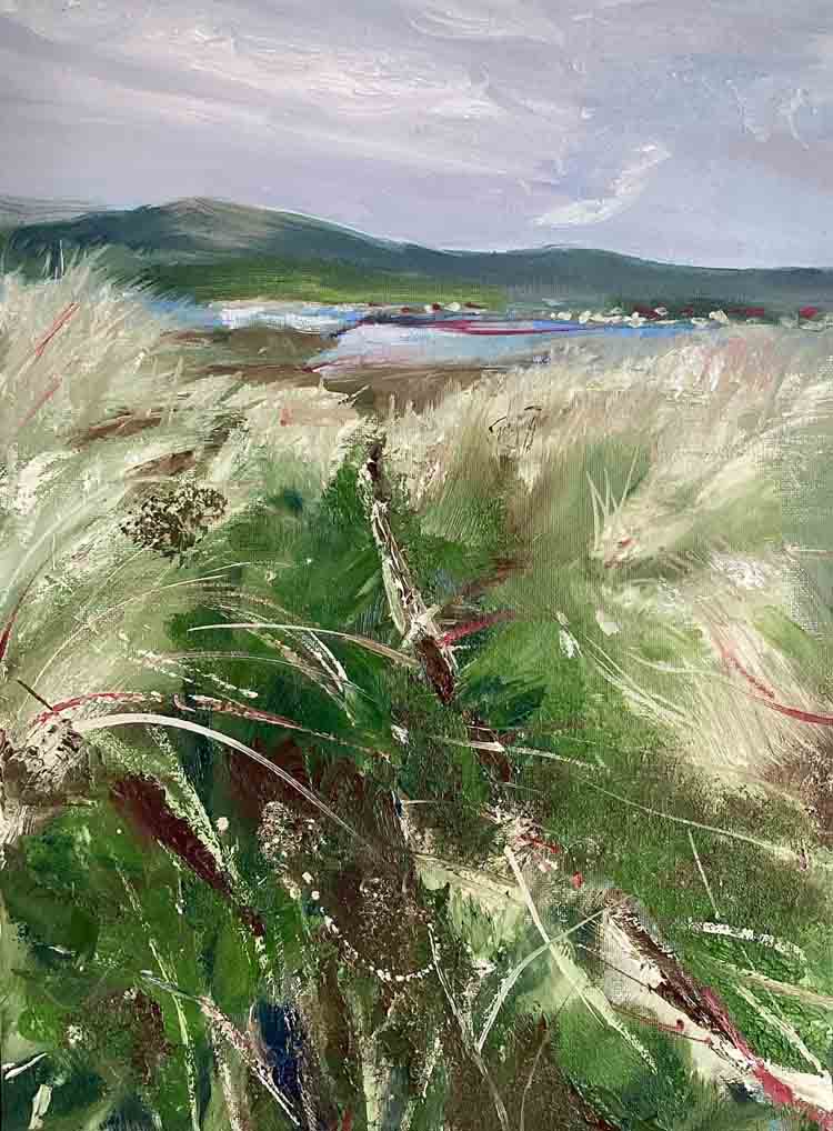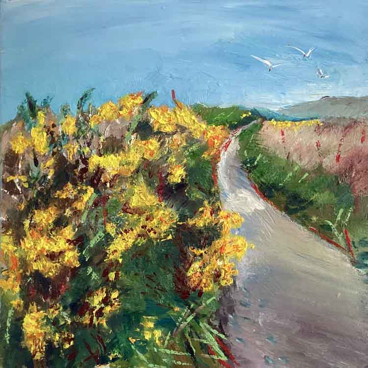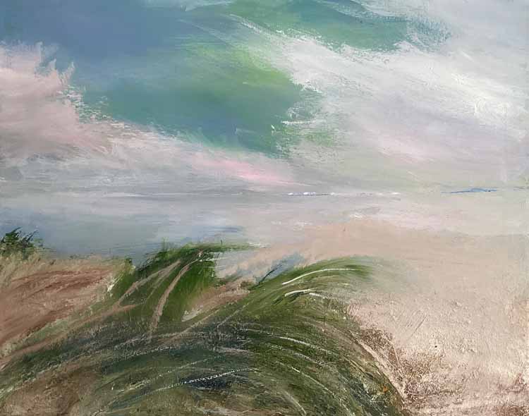 Recently I am inspired by the coastline around my home. I have become familiar with this area walking the same routes every day. I feel comfortable and reassured by the coastal paths in the sand dunes, the rhythmic elements of grasses following the direction of the air flow. Sunsets and the play of light on the sky and sand. The dynamic of people walking dogs. Upturned boats in a disordered heap. Seagulls flying high in the sky. Yellow gorse, Conwy Mountain and Puffin Island.