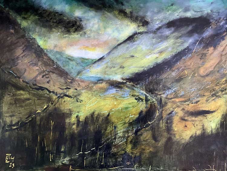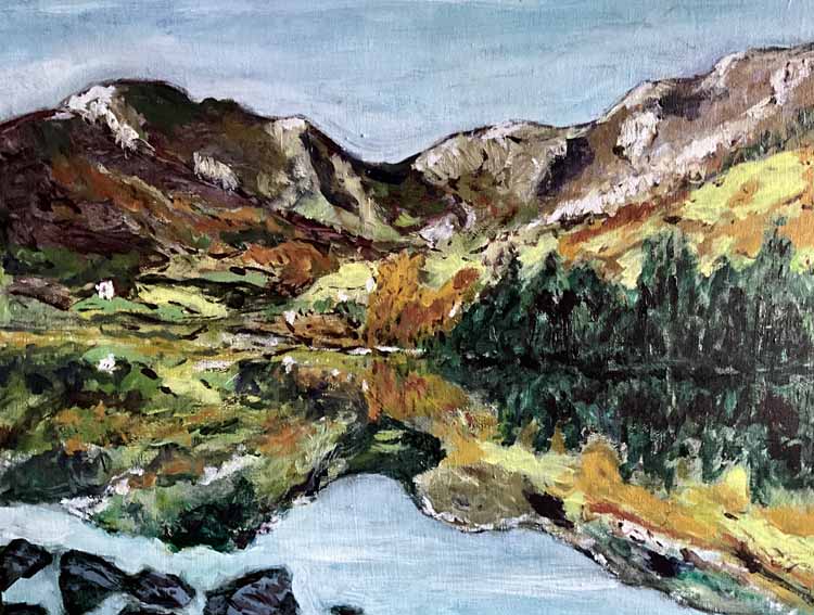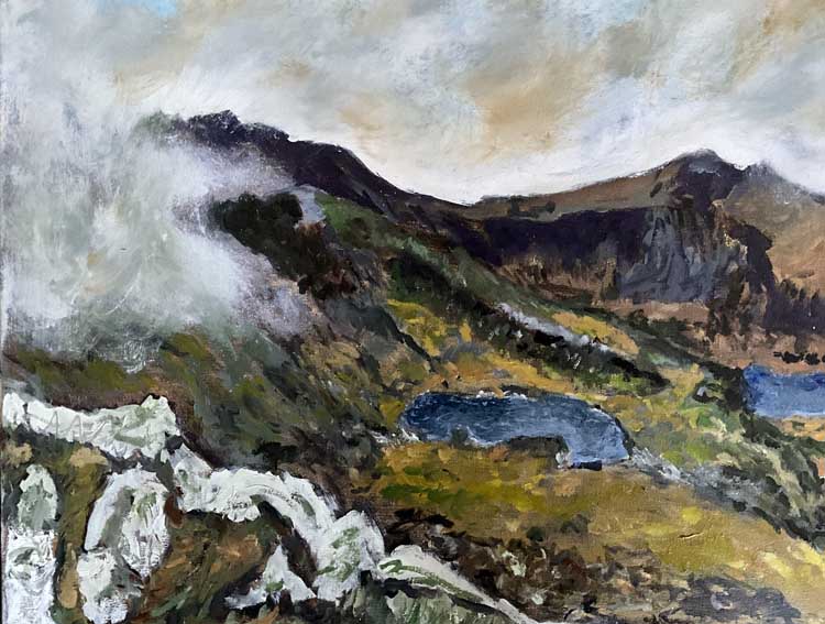 Brian started painting in oils on his eightieth birthday. Since then he has enjoyed experimenting with the ways in which oils can be used to express forms, light and moods of the North Wales landscape.